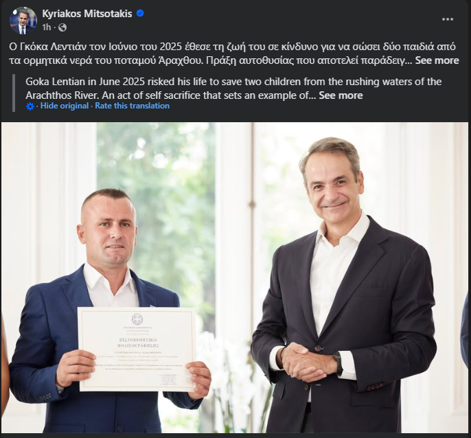 “Ledian Goka në qershor të vitit 2025 rrezikoi jetën e tij për të shpëtuar nga mbytja dy fëmijë në ujërat e rrëmbyeshëm të lumit Arachthos. Një akt vetëmohimi që është një shembull i humanizmit dhe heroizmit. Sot atij iu dha nënshtetësia greke. E falenderojmë”, ka shkruar në Facebook Kryeministri Mitsotakis.