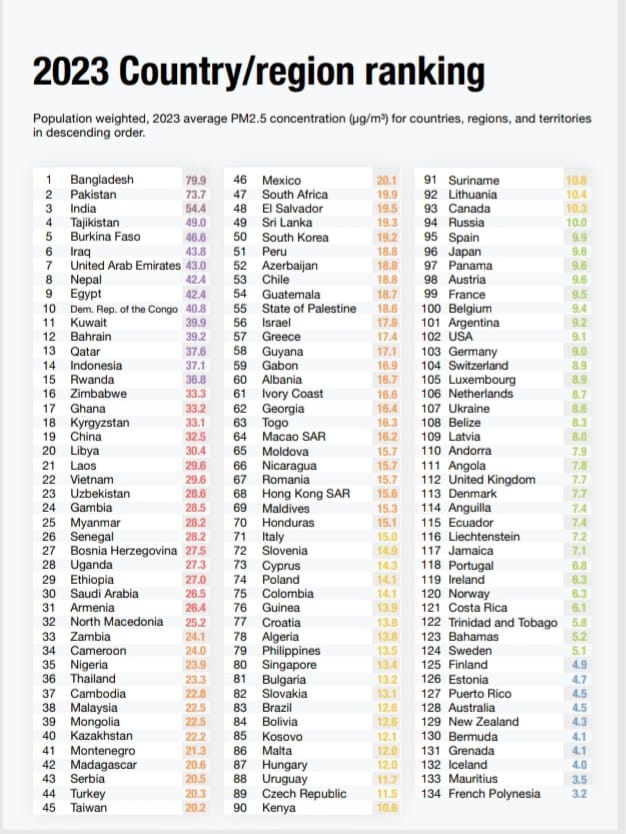 Në rang global Begusarai, një qytet me gjysmë milion banorë në shtetin Bihar të Indisë veriore, ishte qyteti më i ndotur në botë vitin e kaluar me një përqendrim mesatar vjetor të PM2.5 prej 118.9 – 23 herë më shumë se udhëzimet e OBSH-së. Ajo u pasua në renditjen e IQAir nga qytetet indiane të Guwahati, Assam; Delhi; dhe Mullanpur, Punjab./Monitor